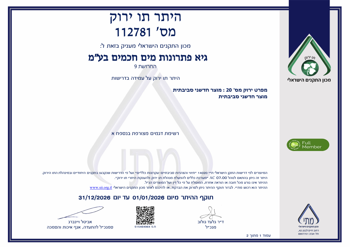 מכון התקנים הישראלי מעניק היתר תו ירוק לגיא פתרונות מים חכמים בע"מ